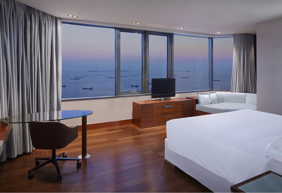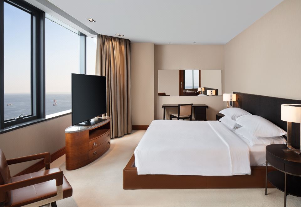 喜来登套房 140 平方米,可使用俱乐部酒廊,一卧室特色套房,配有 1 张特大床,海景